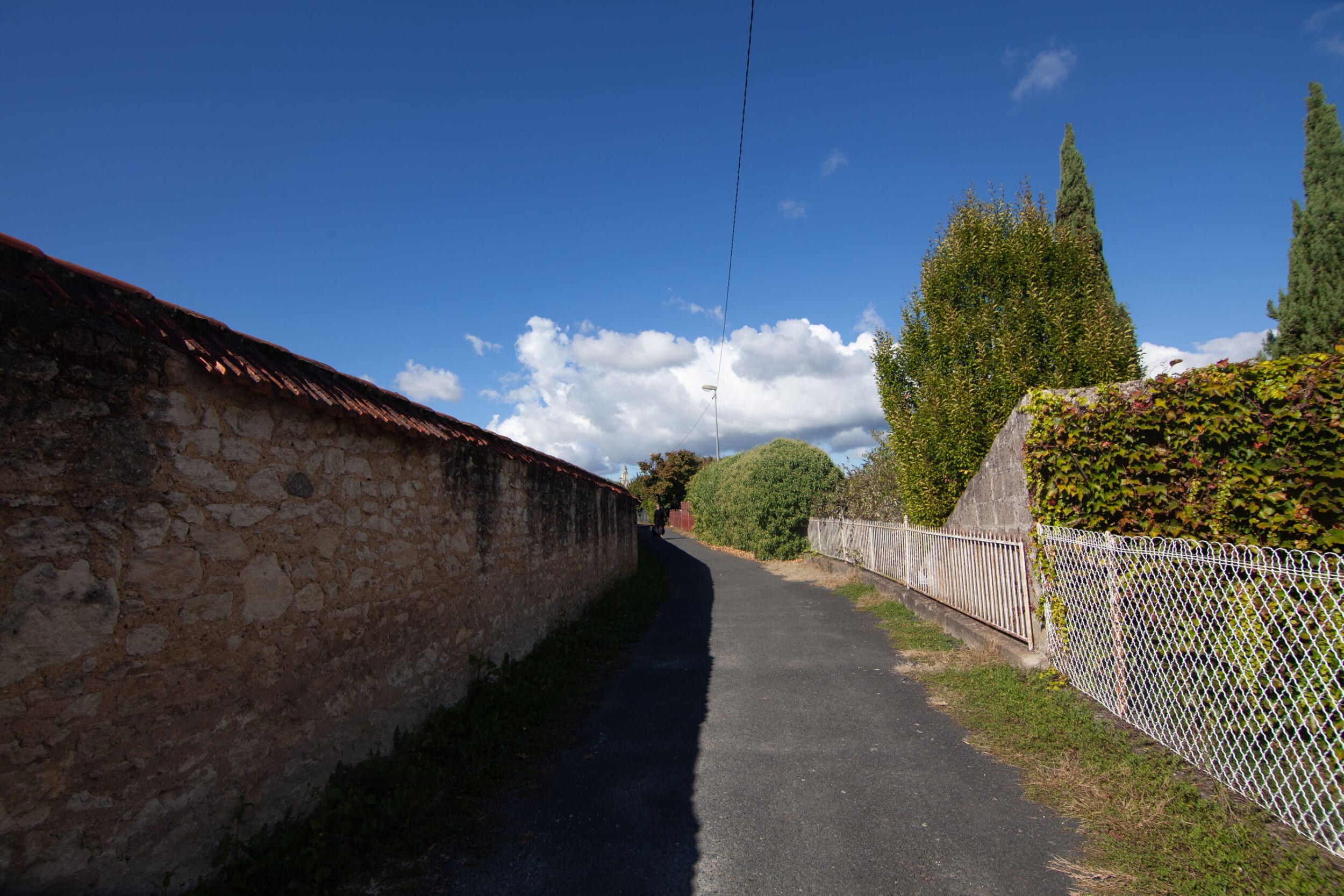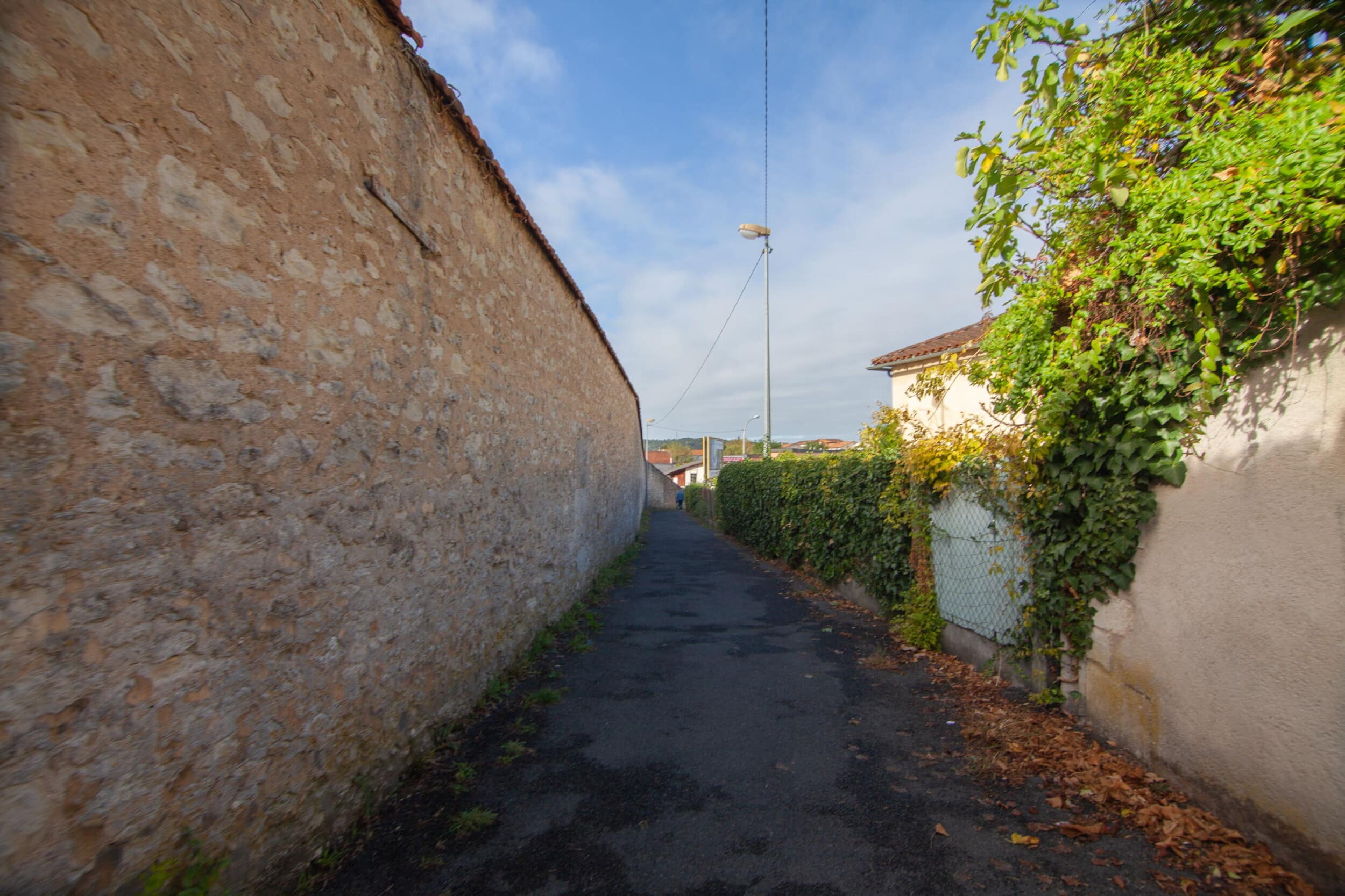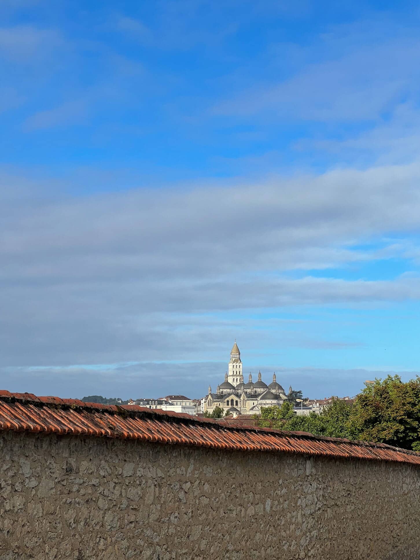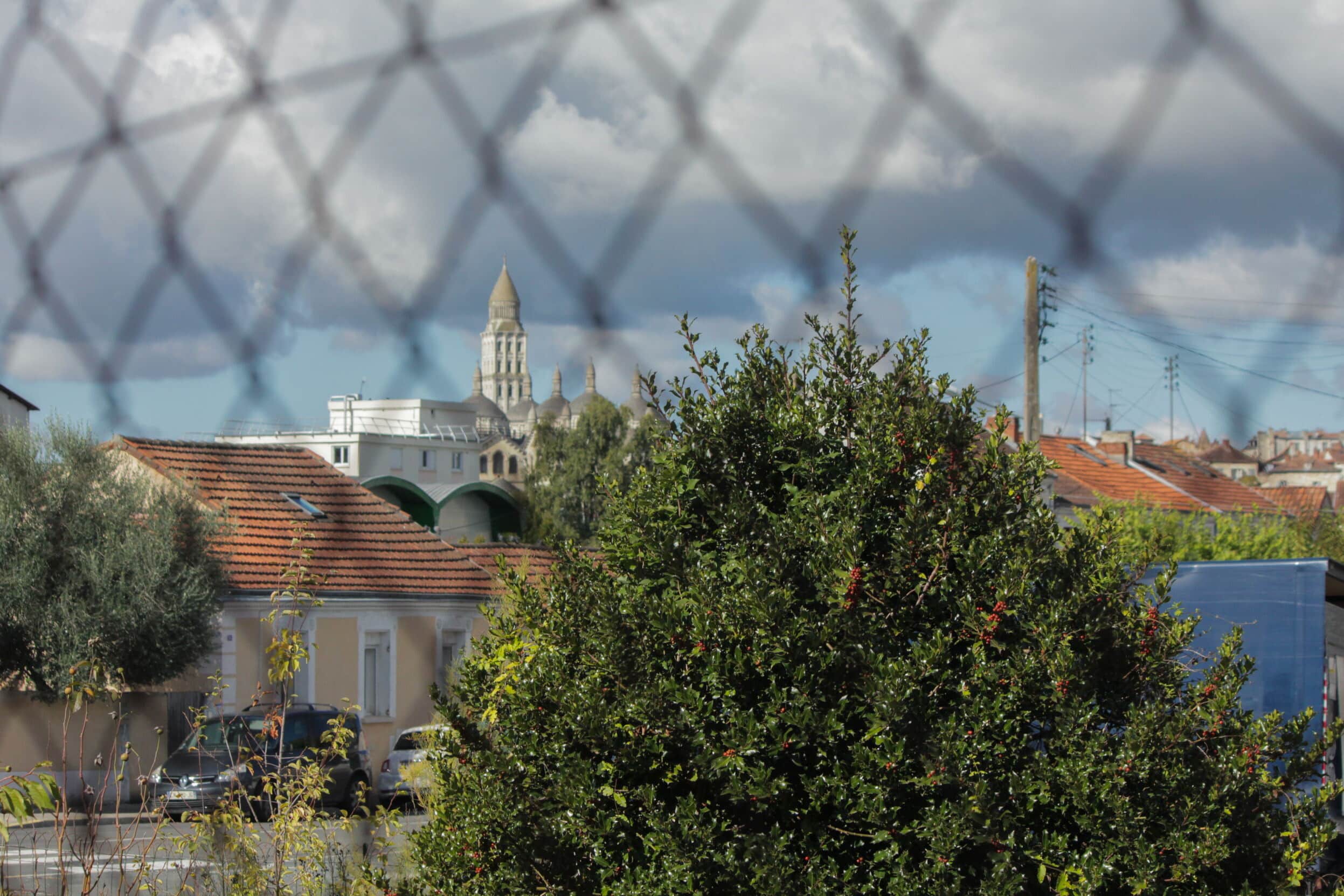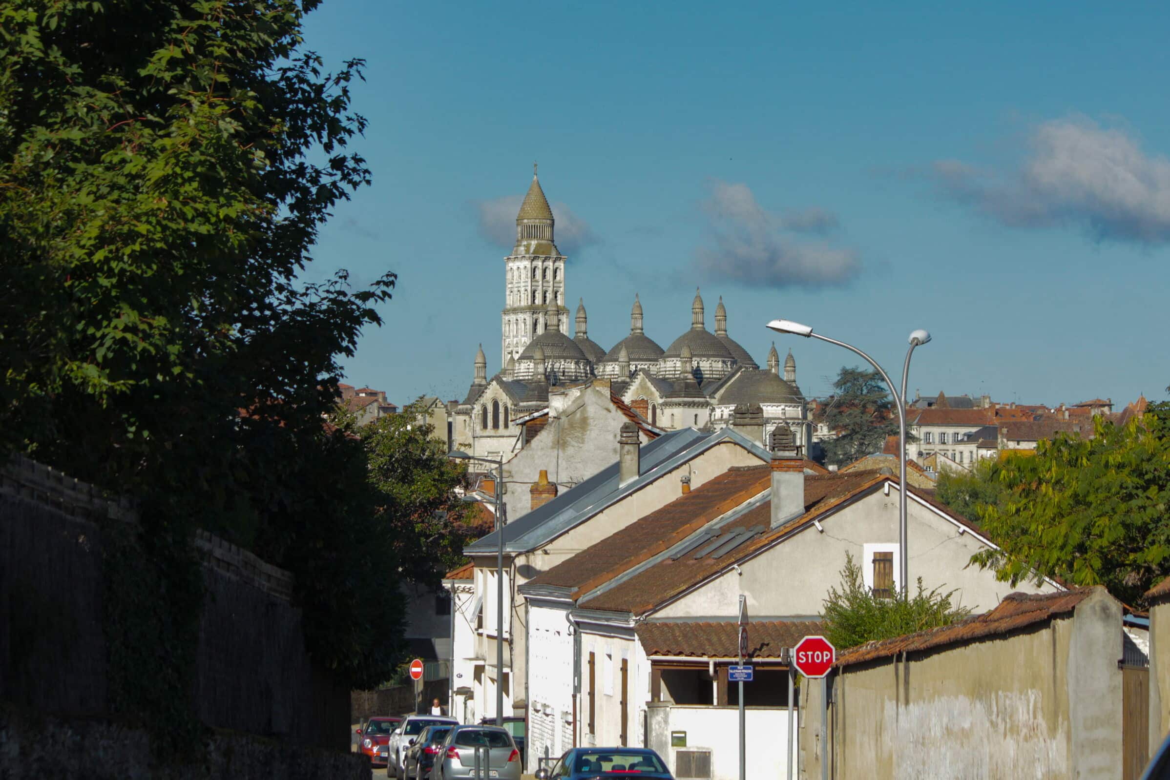 ‘Vances de colar vers la ruá Jean Clédat, nòstra escorciera coma un punt de vuda remarcable ofrís a veire la catedrala Sent Front e l’Ospitau.