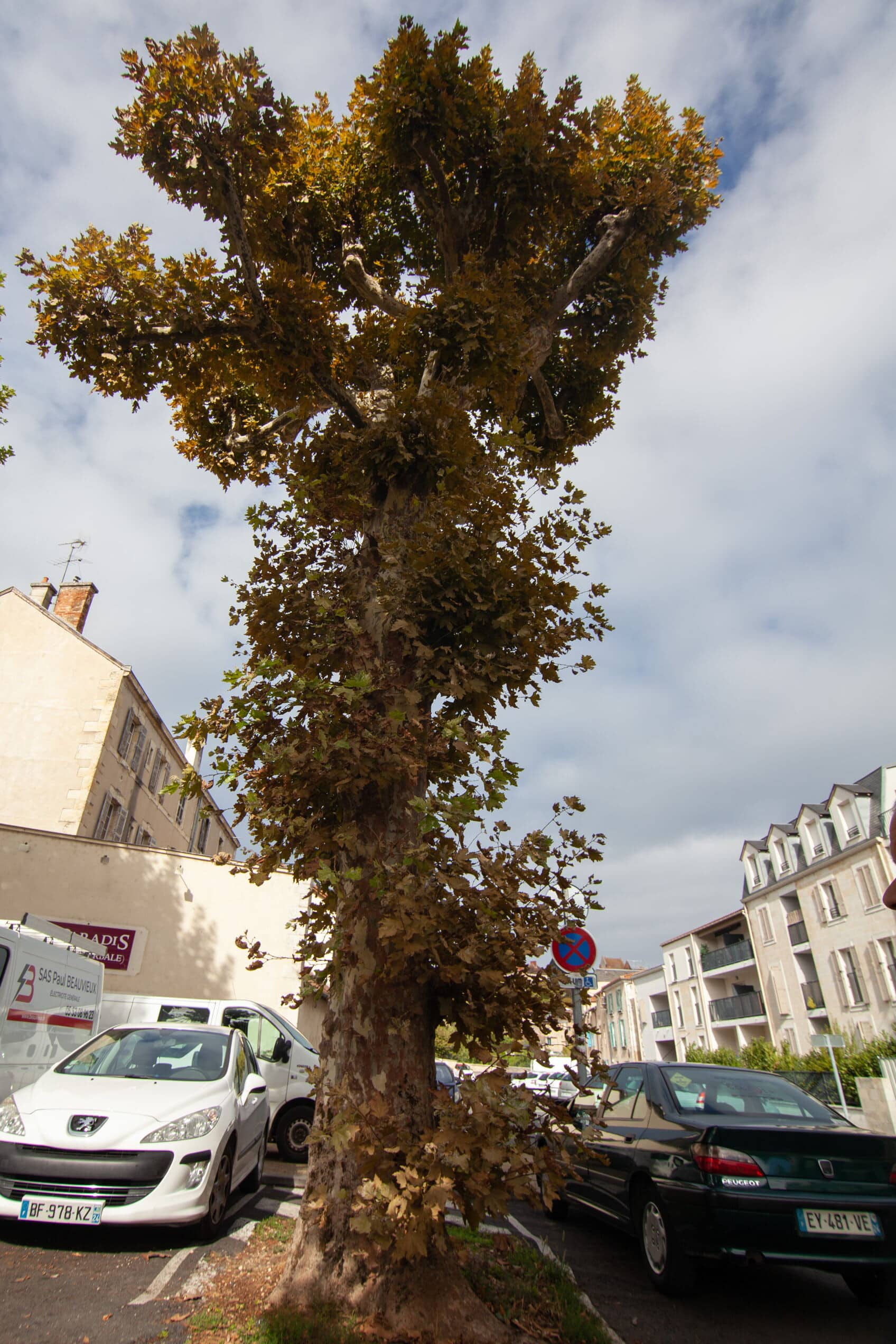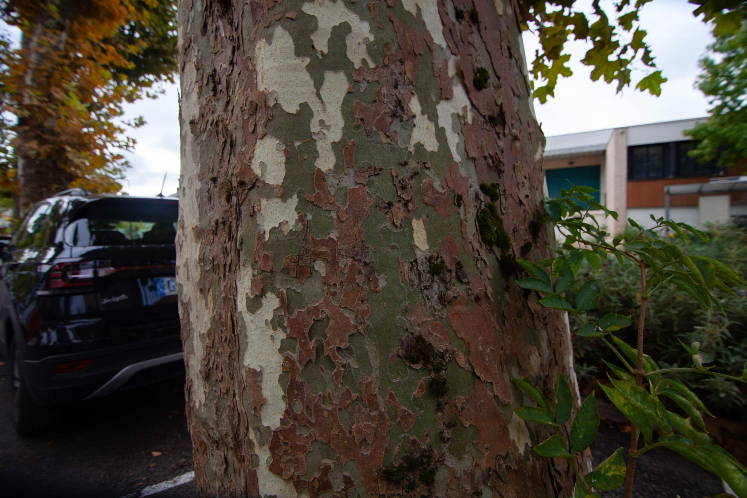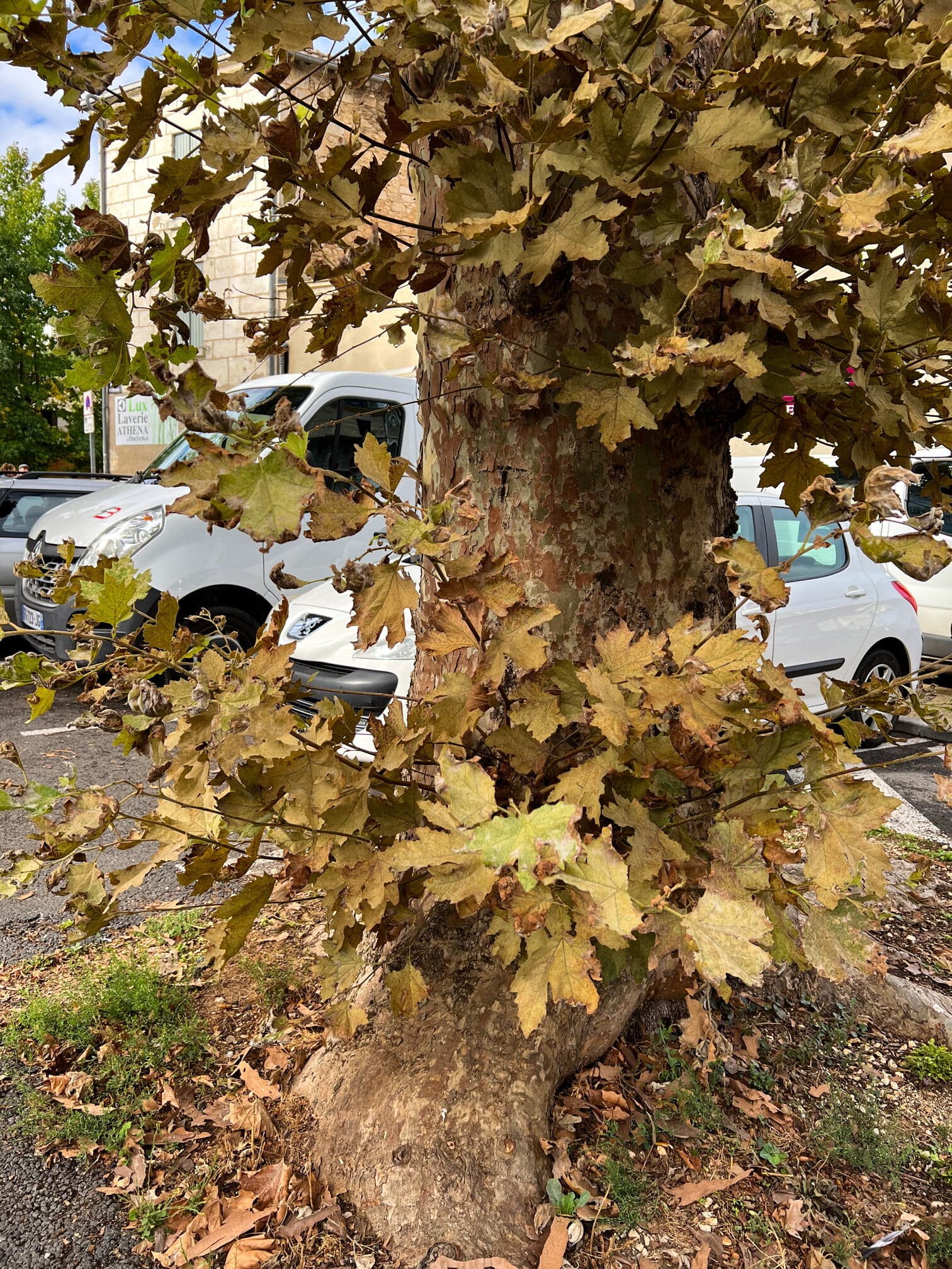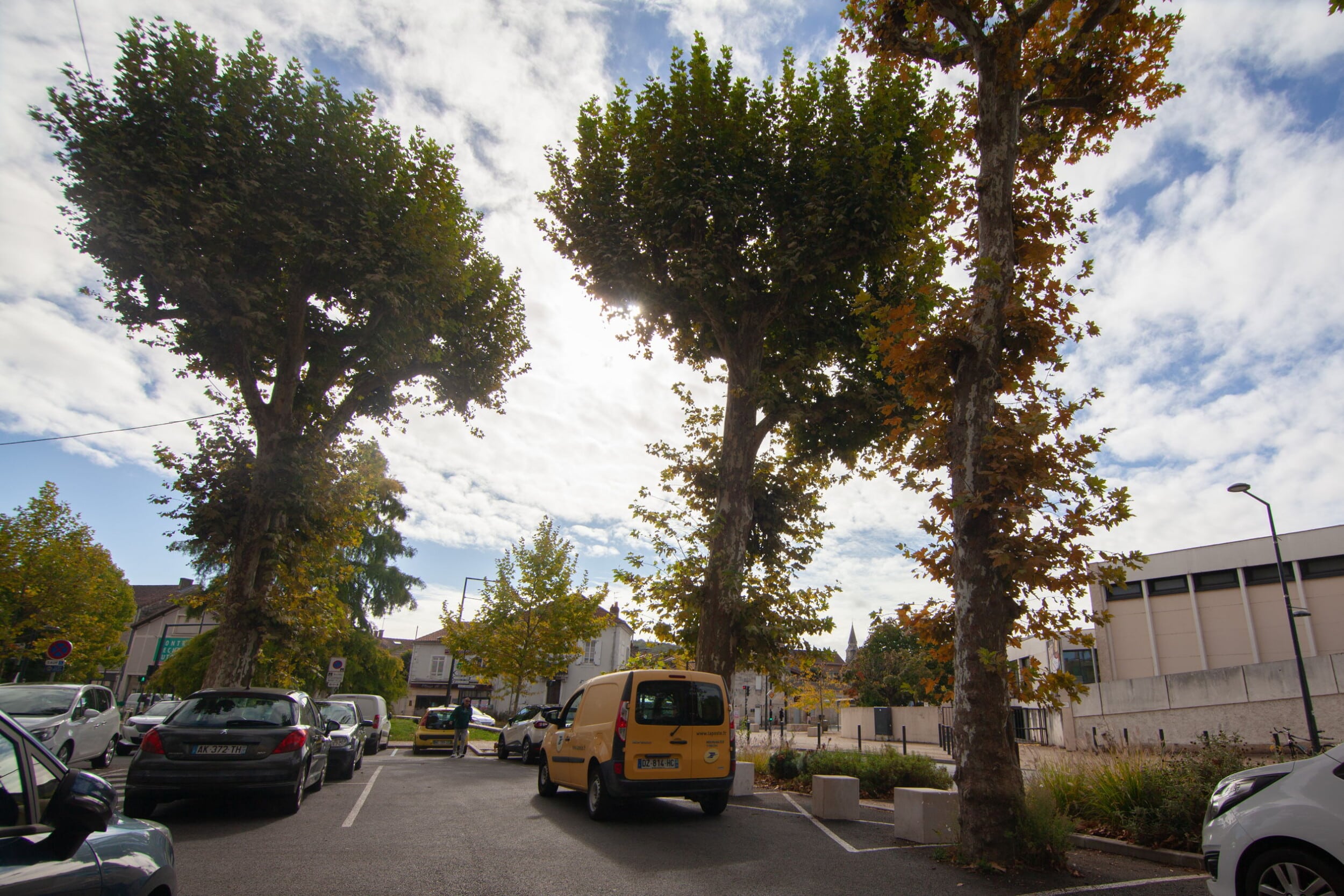 Cette place est bordée de platanes. Arbres élancés comme des colonnes au tronc doux et écaillé, les platanes sont des arbres d’usage par leurs larges feuilles (du grec Platos qui signifie large) qui garantissent une ombre dense et fraîche pour protéger les jeux des enfants, les bavardages, les jeux de boules… Ici, ce sont les voitures qui se protègent du soleil.