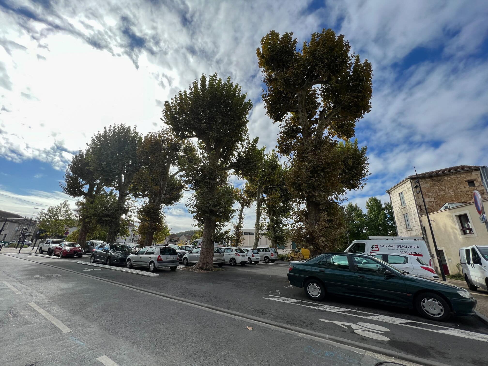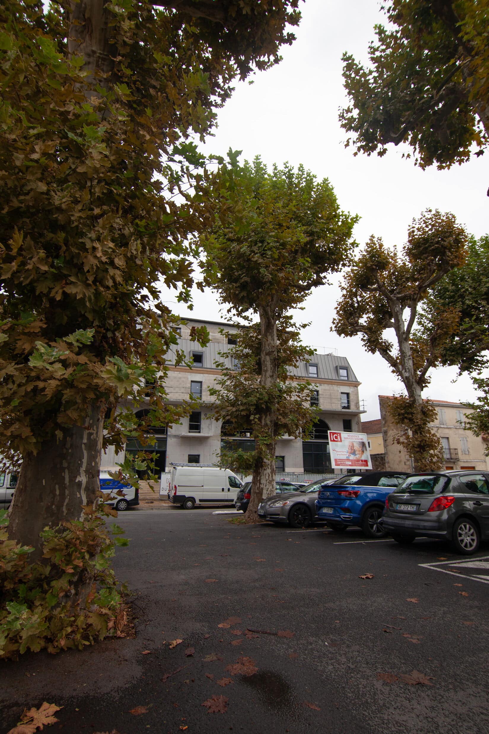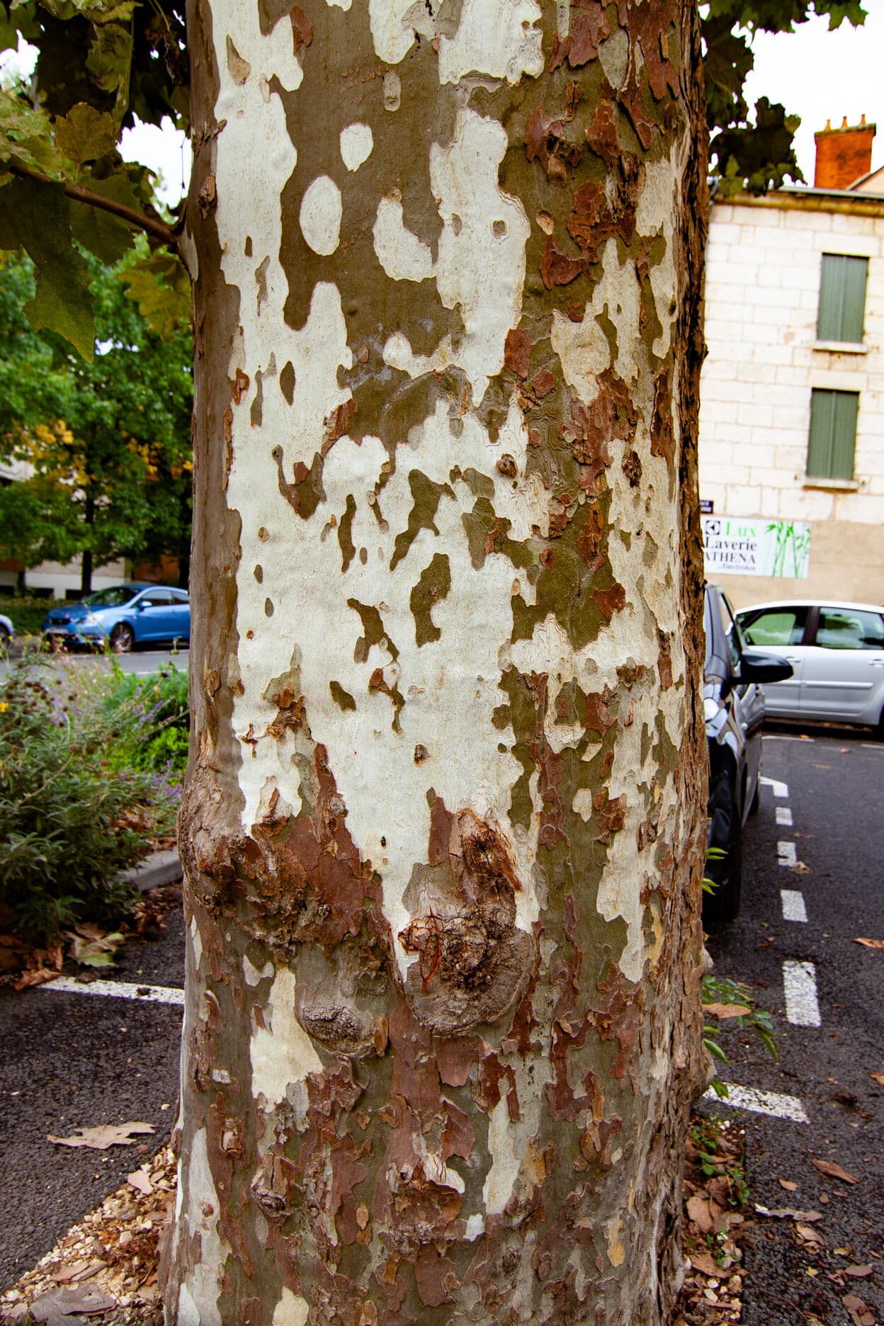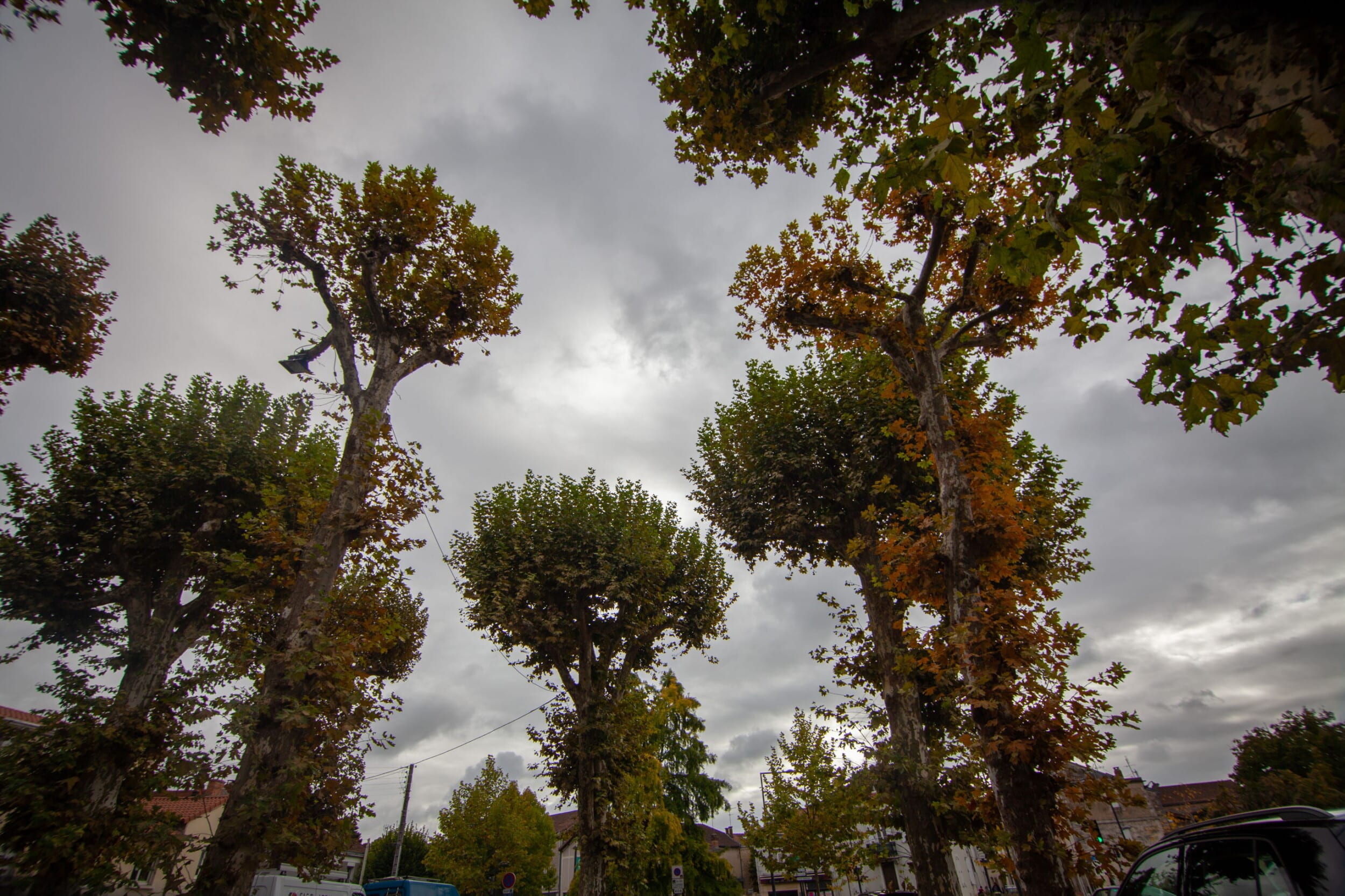 Cette place est bordée de platanes. Arbres élancés comme des colonnes au tronc doux et écaillé, les platanes sont des arbres d’usage par leurs larges feuilles (du grec Platos qui signifie large) qui garantissent une ombre dense et fraîche pour protéger les jeux des enfants, les bavardages, les jeux de boules… Ici, ce sont les voitures qui se protègent du soleil.