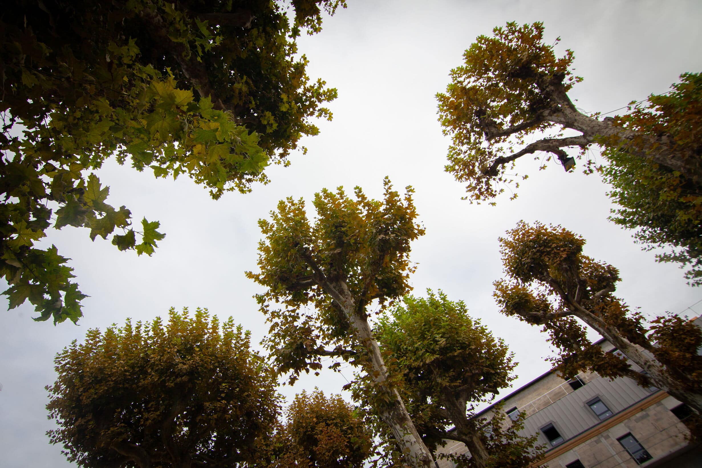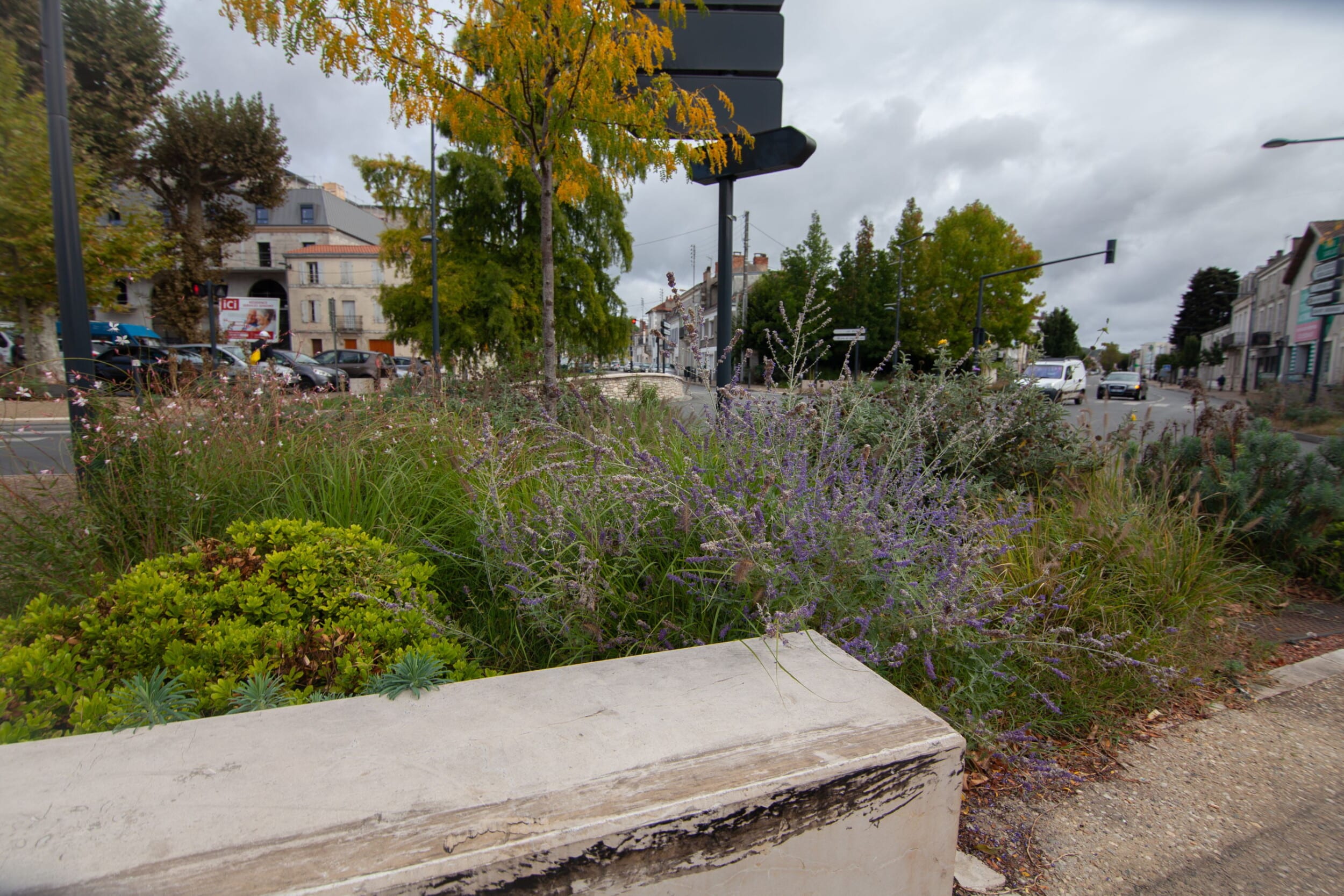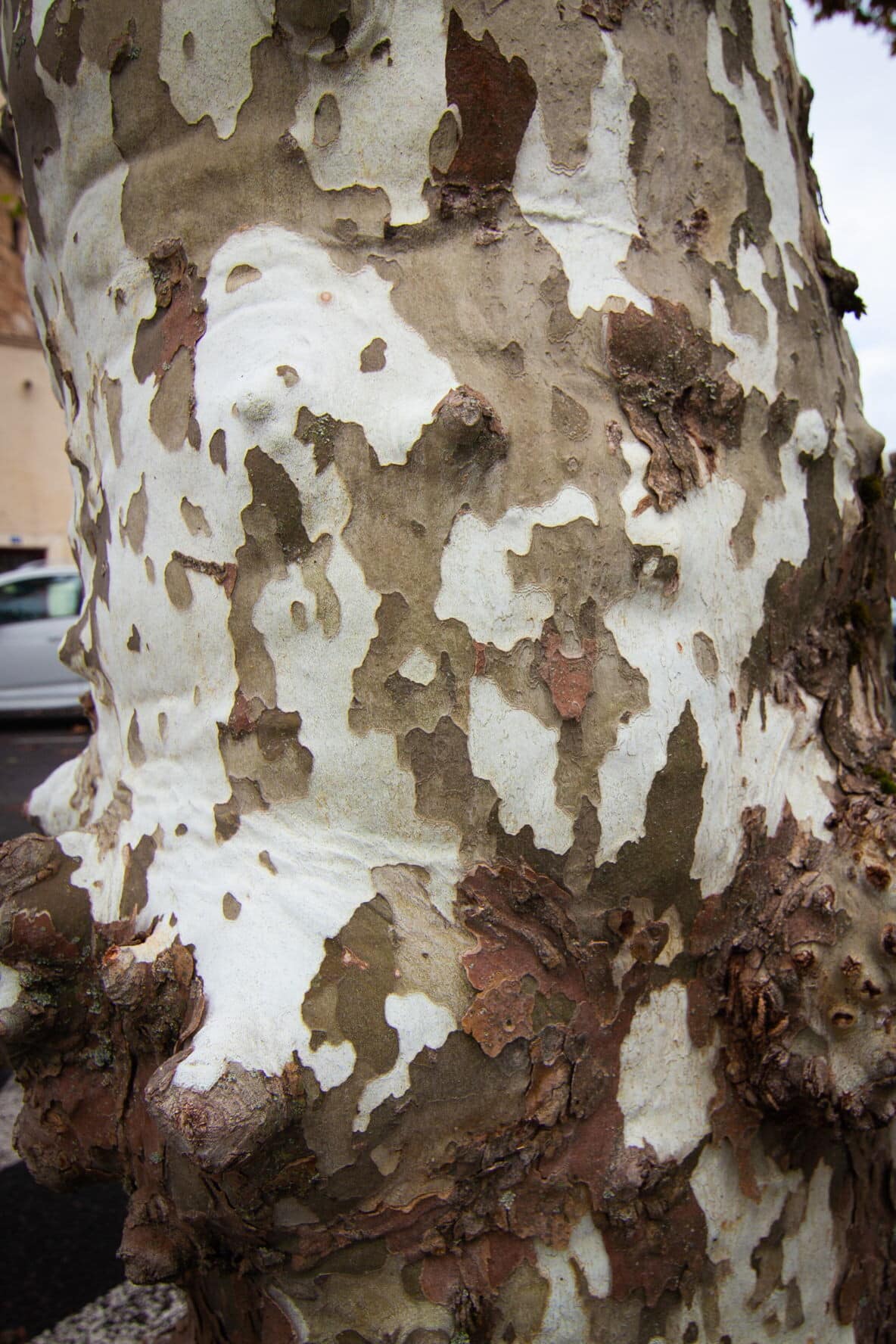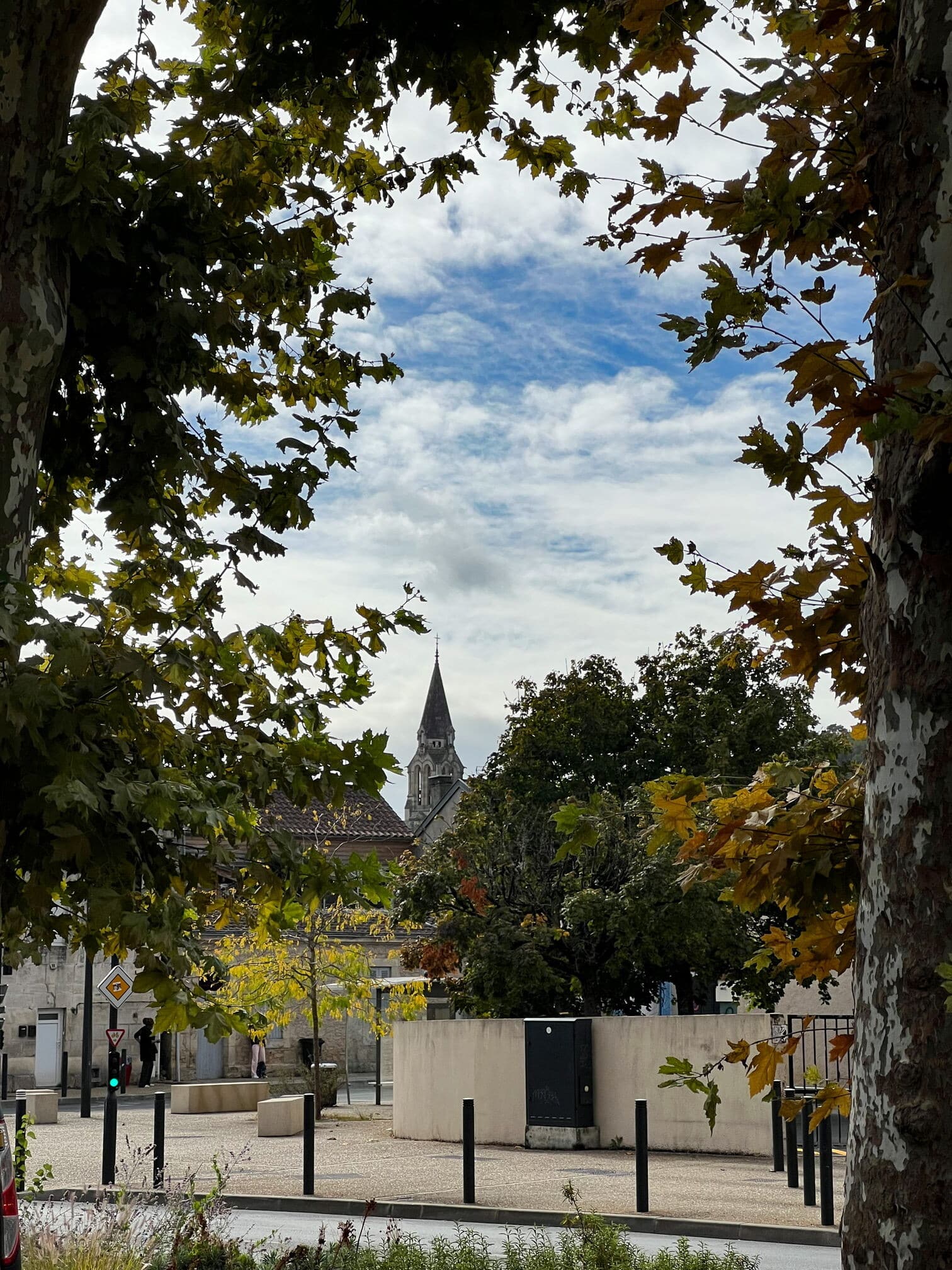 Cette place est bordée de platanes. Arbres élancés comme des colonnes au tronc doux et écaillé, les platanes sont des arbres d’usage par leurs larges feuilles (du grec Platos qui signifie large) qui garantissent une ombre dense et fraîche pour protéger les jeux des enfants, les bavardages, les jeux de boules… Ici, ce sont les voitures qui se protègent du soleil.