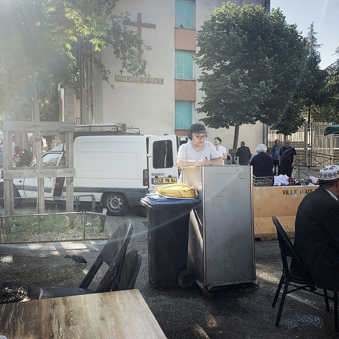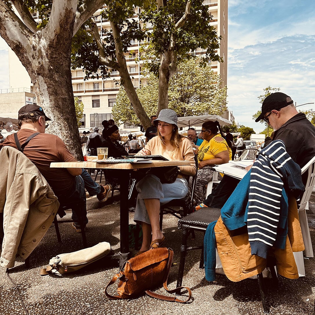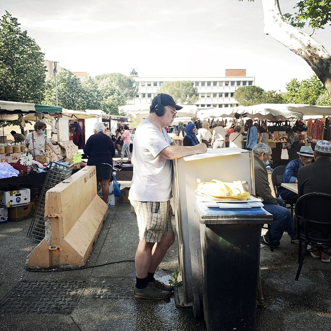 Sur la place Romée de Villeneuve le marché bat son plein. Non loin de là, les artistes de la Compagnie Ouïe/Dire arpentent les rues du quartier à l’affût des moindres événements, à l’écoute des paroles des habitants et en quête des petits récits qui fabriquent depuis 60 ans l’histoire d’Encagnane.