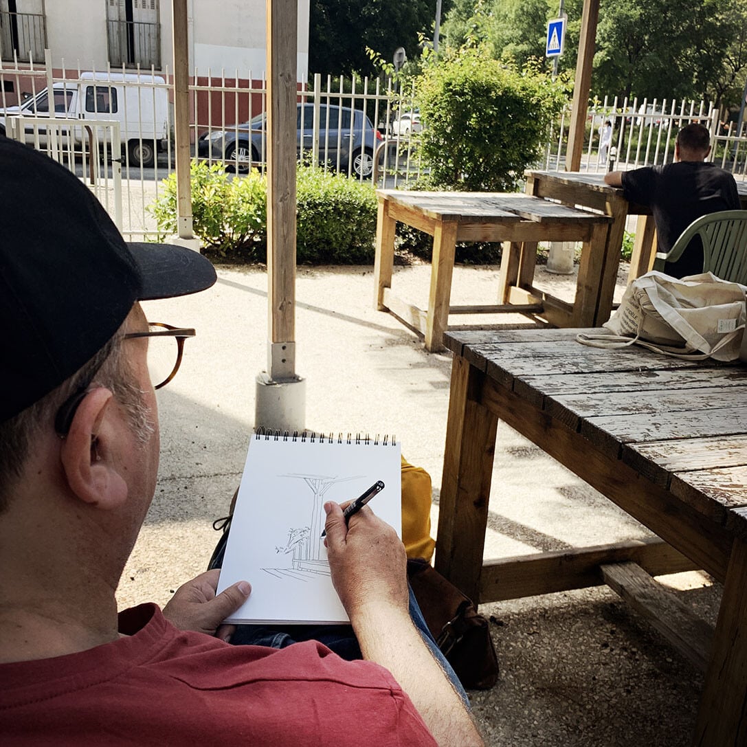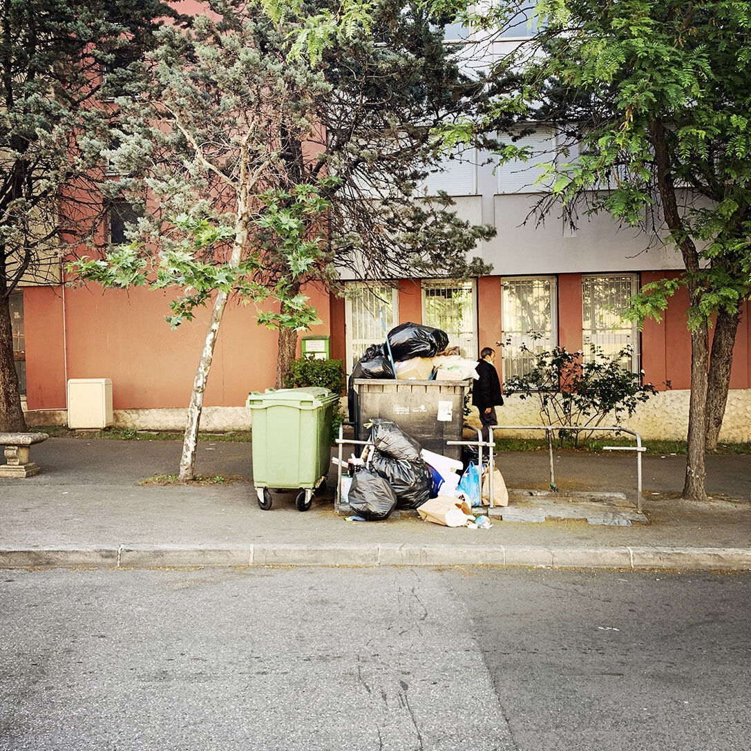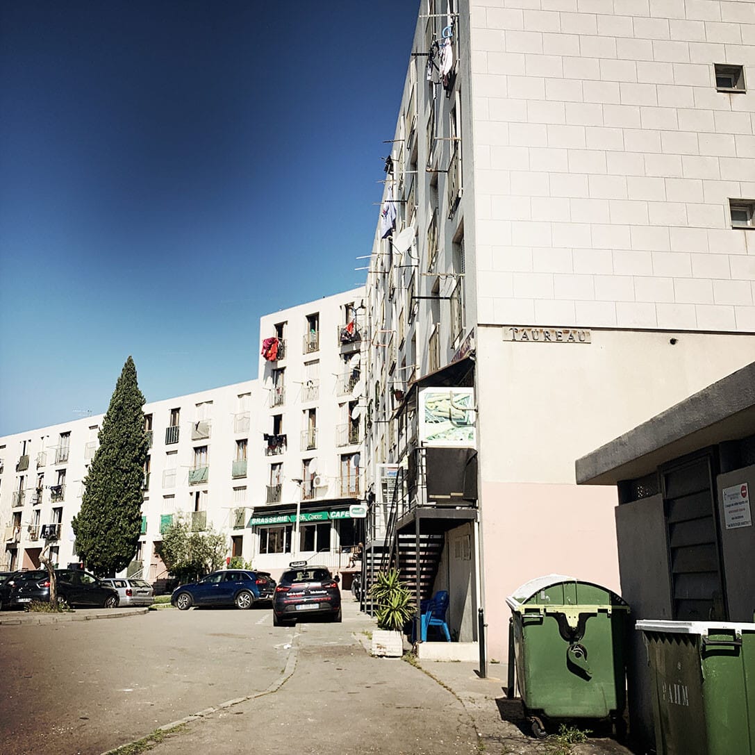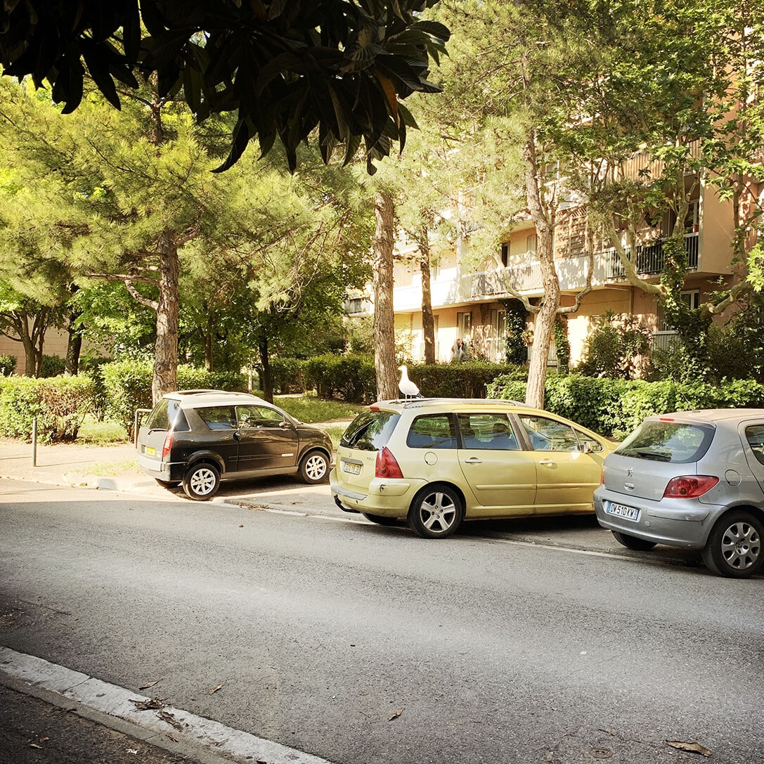 Au Snack and Food, rue Emile Henriot, le patron nous accueille avec le sourire. Il nous explique qu’il vient de reprendre le fonds de commerce, qu’il est ouvert depuis 15 jours et qu’il ne peut pas encore servir à manger. Il s’excuse. Il souhaite refaire la cuisine. Les travaux commencent la semaine prochaine. Il nous installe une table dehors. Une dizaine de mouettes braillent sur les toits. Les martinets tournent dans le ciel. Sur la terrasse en fin d’après-midi, quelques personnes se prélassent devant un café. Une parabole accrochée sur un balcon semble d’un autre temps. Du linge pendouille aux fenêtres. Deux pigeons dodelinent sur le trottoir, à la recherche de quelques miettes abandonnées. L’un d’eux trouve un quignon de pain sur le bord de la route, aussitôt, l’autre le lui dispute, et puis rapidement ils sont une quinzaine à s’exciter sur le bout de pain sec. Le premier s’envole et lâche l’affaire, dégoûté. L’ambiance sur la petite place est paisible. Les gens sont tranquilles. Le temps semble au ralenti, presque immobile. Nous partons à la découverte du quartier.