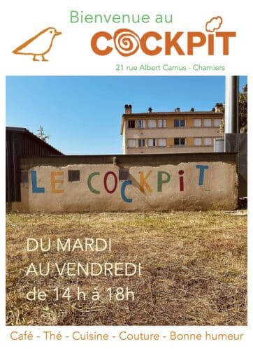 Situé au rez-de-chaussée du bâtiment D de la Cité HLM Jacqueline Auriol, le Cockpit est un lieu culturel de proximité et un atelier pour les artistes en résidence dans le cadre du programme Cultures Proches. Expositions, concerts, projections, repas, apéro, barbecue y sont organisés régulièrement. Ce lieu est devenu un espace de vie sociale et de rencontre pour les personnes du quartier et d’ailleurs.