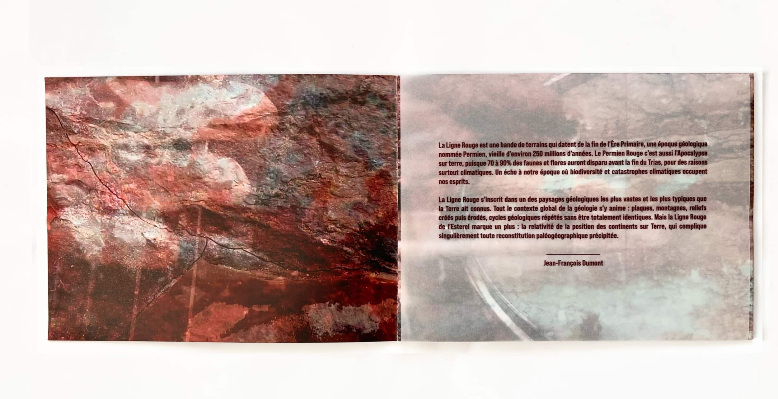La Ligne Rouge est une bande de terrains qui datent de la fin de l’Ère Primaire, une époque géologique nommée Permien, vieille d’environ 250 millions d’années. Le Permien Rouge c’est aussi l’Apocalypse sur terre, puisque 70 à 90% des faunes et flores auront disparu avant la fin du Trias, pour des raisons surtout climatiques. Un écho à notre époque où biodiversité et catastrophes climatiques occupent nos esprits.