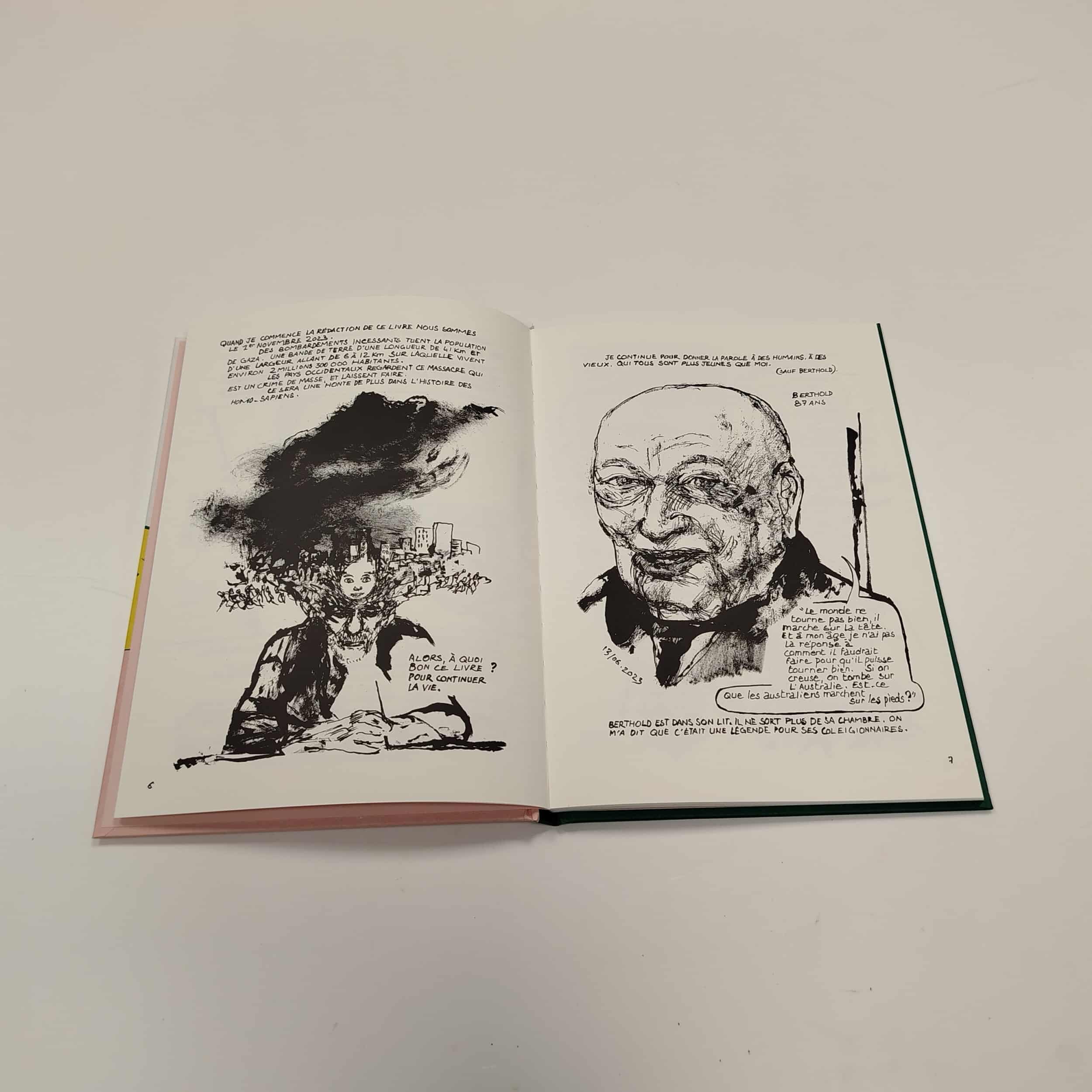 En juin 2023, Edmond Baudoin est invité à séjourner une dizaine de jours à l’institution des Invalides de la Légion Étrangère, à Puyloubier (13). Cet institut accueille les soldats blessés ou simplement fatigués, s’assure la rééducation des invalides, la réinsertion professionnelle et sociales des anciens légionnaires réformés. Pendant sa résidence, Baudoin part à la rencontre des soldats, du personnel de l’institution et des habitants du village de Puyloubier. Il dessine des portraits et discute avec eux librement. Comme à son habitude, il troque un portrait contre une histoire, une anecdote, un parcours de vie. Il a trainé ses pinceaux partout où les portes se sont ouvertes, il a dessiné les paysages de ce territoire tout en restant attentif et ouvert. Il agence ensuite ses portraits avec la parole des soldats et celle des travailleurs du centre. Il complète son récit avec des réflexions personnelles sur la vie, la guerre et le temps qui passe. Il propose une vision sensible de ces espaces, le dessin comme outil de rencontre vers l’autre.